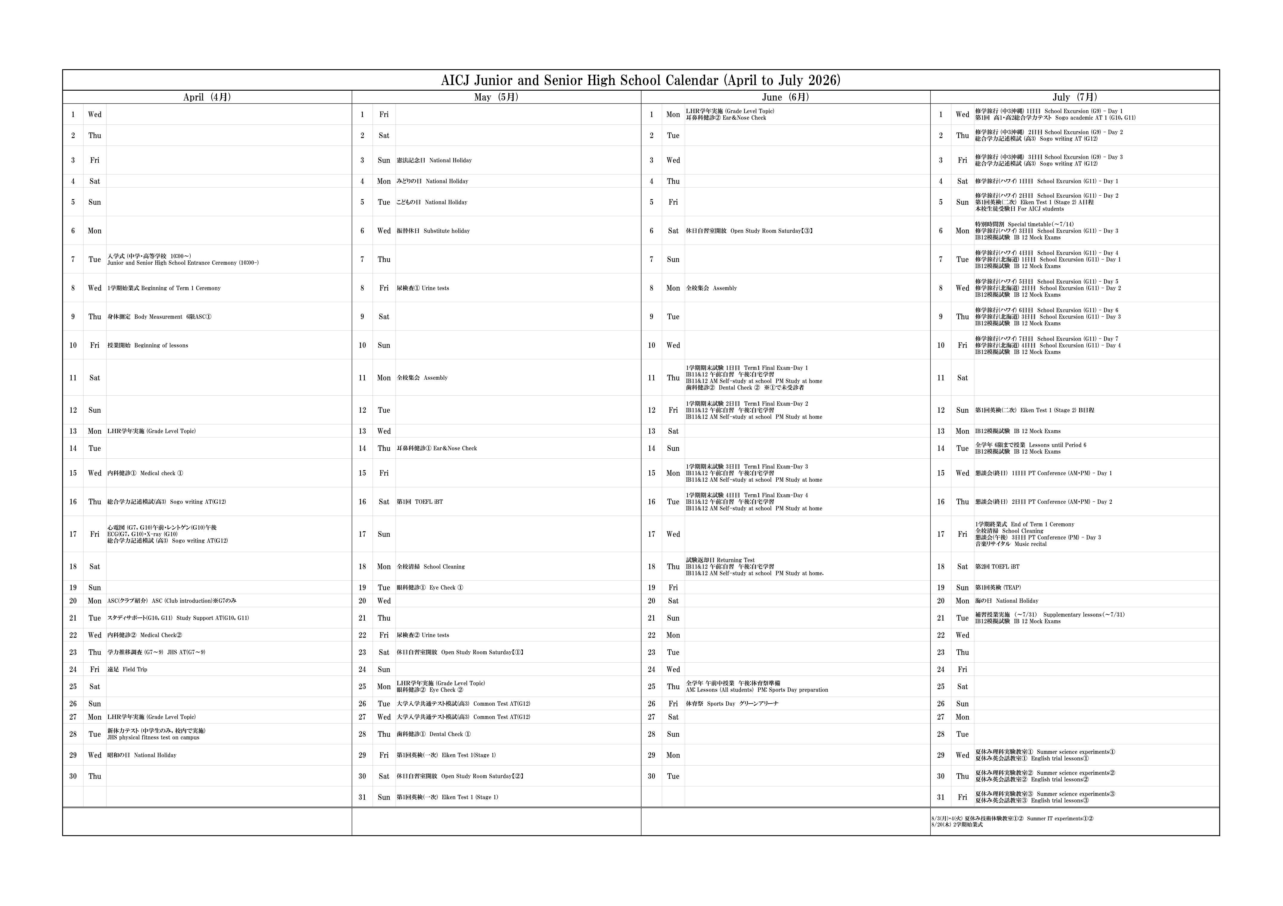 2026年度 4月~7月(1学期) AICJカレンダー